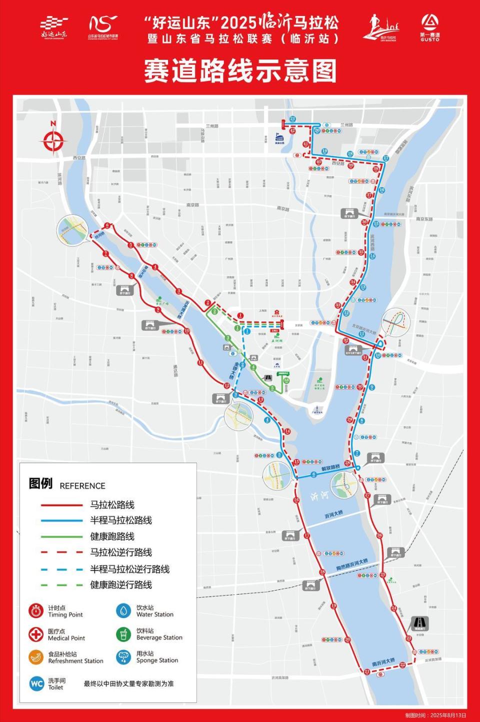 (一)马拉松:五洲湖广场(起点)—北京路—大青山路—祊河路—武汉路祊河大桥—滨河路—南沂河大桥—滨河东路—北京路沂河大桥—滨河西路—西安路—沭河路—兰州路—临沂奥体公园(终点)
